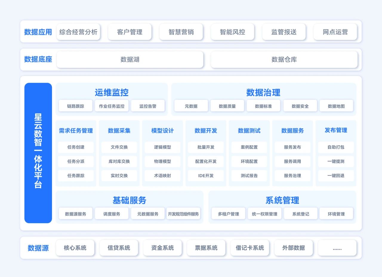 針對上述這些痛點,長亮科技為數據類項目實施團隊著手打造了“星云數智一體化平臺”。作為面向數據運營的一體化平臺,其設計方向主要是滿足數據倉庫和數據湖的數據加工需求,為應用系統提供加工好的數據。并結合DataOps數據運營方法論,實現數據資產的加工、建模和對外服務供給。對數據開發而言,星云平臺可以有效降低管理成本,促進規范統一和落地,提高開發效率和質量。