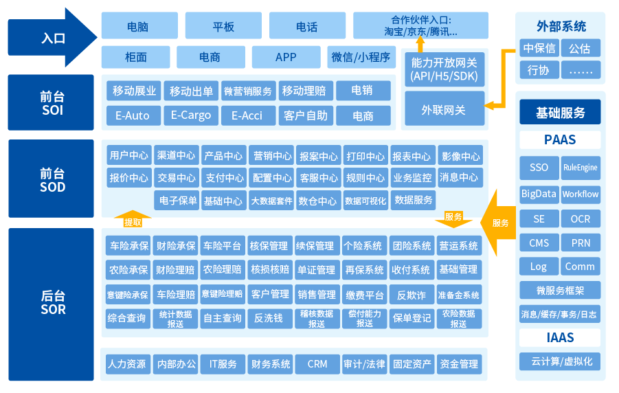 根據Gatner在2016年提出的一份《Pace-Layered Application Strategy》報告,按照“步速”將企業的應用系統劃分為三個層次,SOR(Systems of record ),SOD(Systems of differentiation)和SOI(Systems of innovation),保險企業的整體架構可按前臺、中臺和后臺相對應進行劃分。