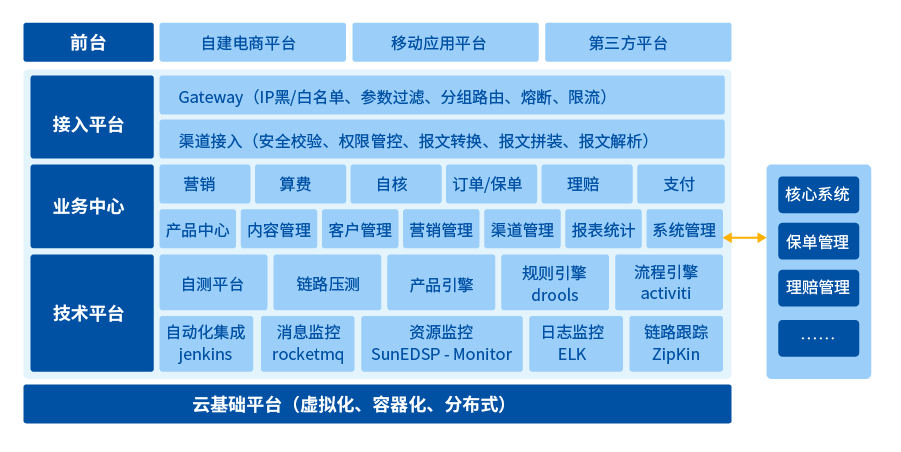 長亮保泰團隊根據多年互聯網保險系統建設經驗,重點關注保險業務創新支持,打造一個產品工廠+多渠道接入+互聯網平臺的中臺架構,逐步形成企業級的業務能力和技術能力復用平臺,如下圖所示:
