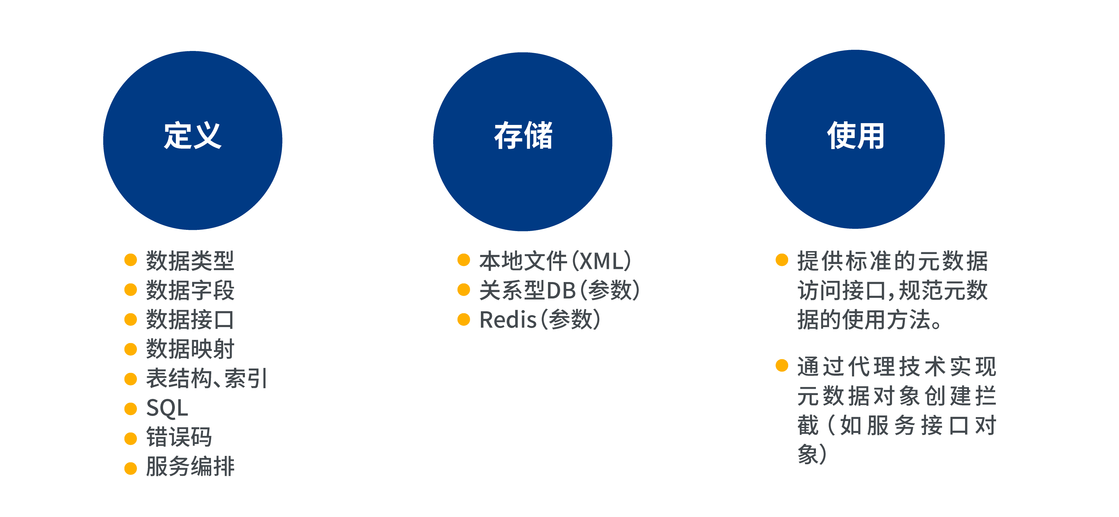 元數據,向應用組件提供類型、字段、接口、服務編排、表結構、SQL、錯誤碼等數據的定義、存儲和使用。元數據的最大價值是支撐標準的落地,讓應用組件的開發(fā)標準化。