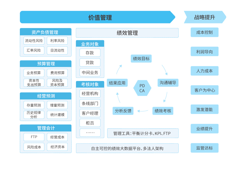 在業(yè)務架構上,績效考核平臺深度契合到銀行整體經營與價值管理中,通過深入結合銀行資產負債、預算等業(yè)務流程和管理需要,以績效大數(shù)據(jù)平臺為基礎,經營業(yè)績?yōu)橹攸c,平衡計分卡、KPI等為工具,將銀行的戰(zhàn)略、資源、業(yè)務和行動有機地結合起來所構成的一個完整的管理體系,幫助銀行實現(xiàn)對機構、部門、柜員以及客戶經理等全員的精細化的績效管理,實現(xiàn)全行的戰(zhàn)略落地與績效提升。