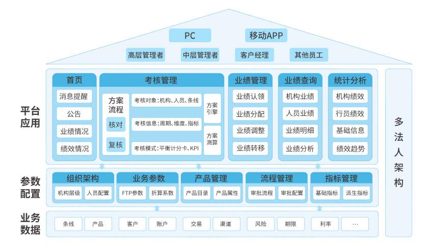 在產品架構上,幫助銀行在全行統(tǒng)一考核體系框架下,實現(xiàn)各級法人、分支機構、營業(yè)網(wǎng)點和人員的差異化考核,各個層級可以靈活配置考核指標和考核方案,把績效管理思路落地到信息化系統(tǒng)。