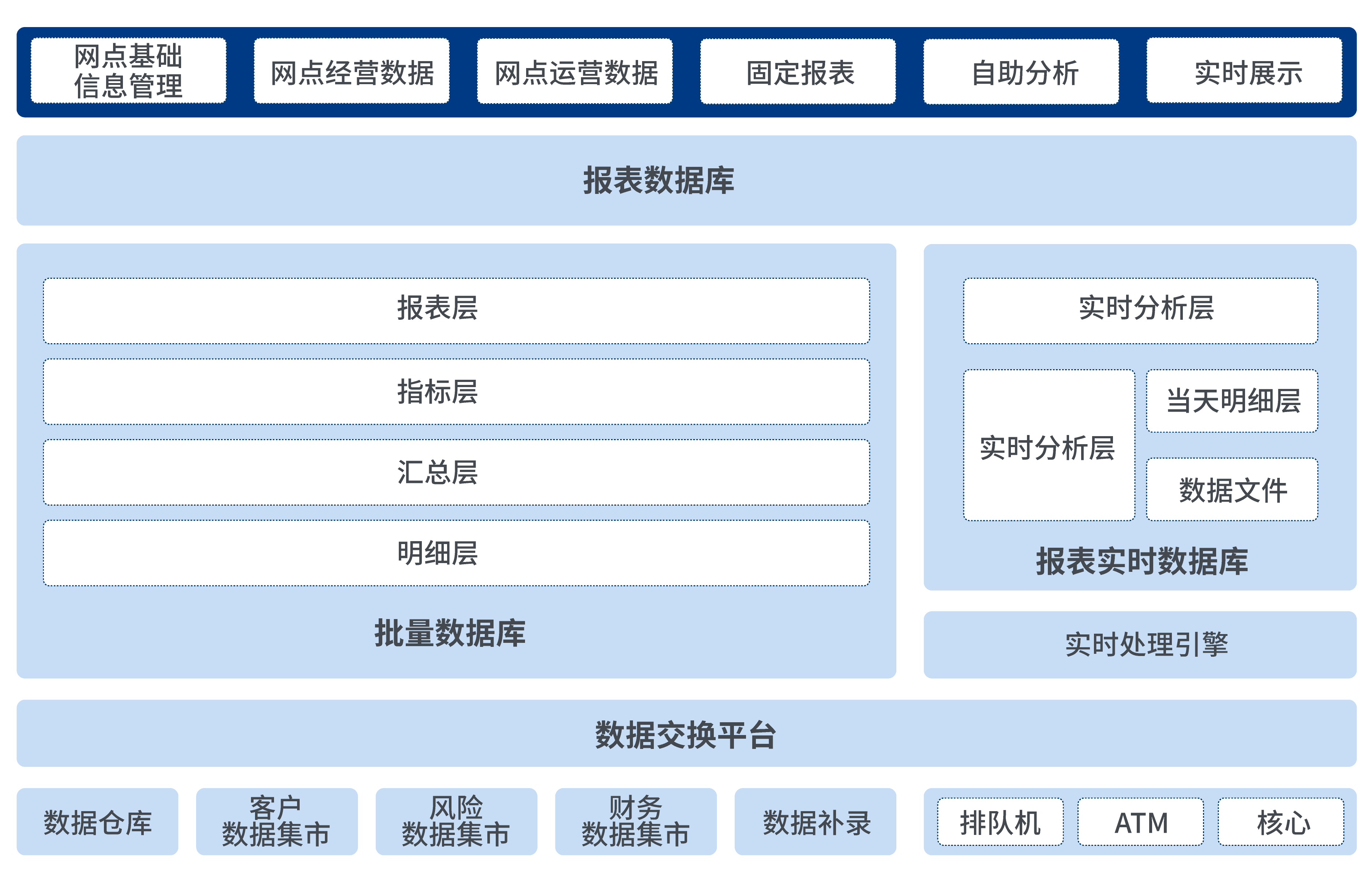 該方案在批量數據層面,全面整合業務系統客戶、財務、風險等業務領域數據,實現對網點經營績效的全面分析;在實時數據層面,對接柜面、ATM、自助查詢機、VTS、排隊機等渠道系統,支持對網點運營效率的實時監控管理。基于后端的數據支持,通過豐富的展示方式向管理人員提供宏觀和微觀業務運營狀況,為網點管理人員提高網點服務水平、網點的效益、工作效率做服務支撐。