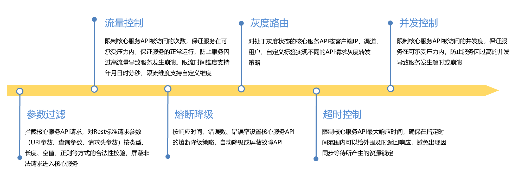 ● 治理體系:從限流控制、參數(shù)過濾、熔斷降級、灰度路由、超時(shí)控制、并發(fā)控制、訪問時(shí)段控制等維度對API訪問進(jìn)行全方位治理。