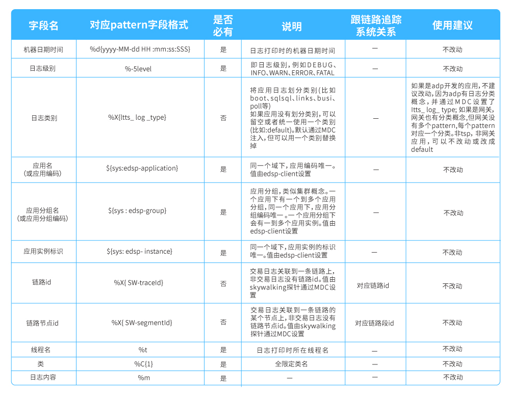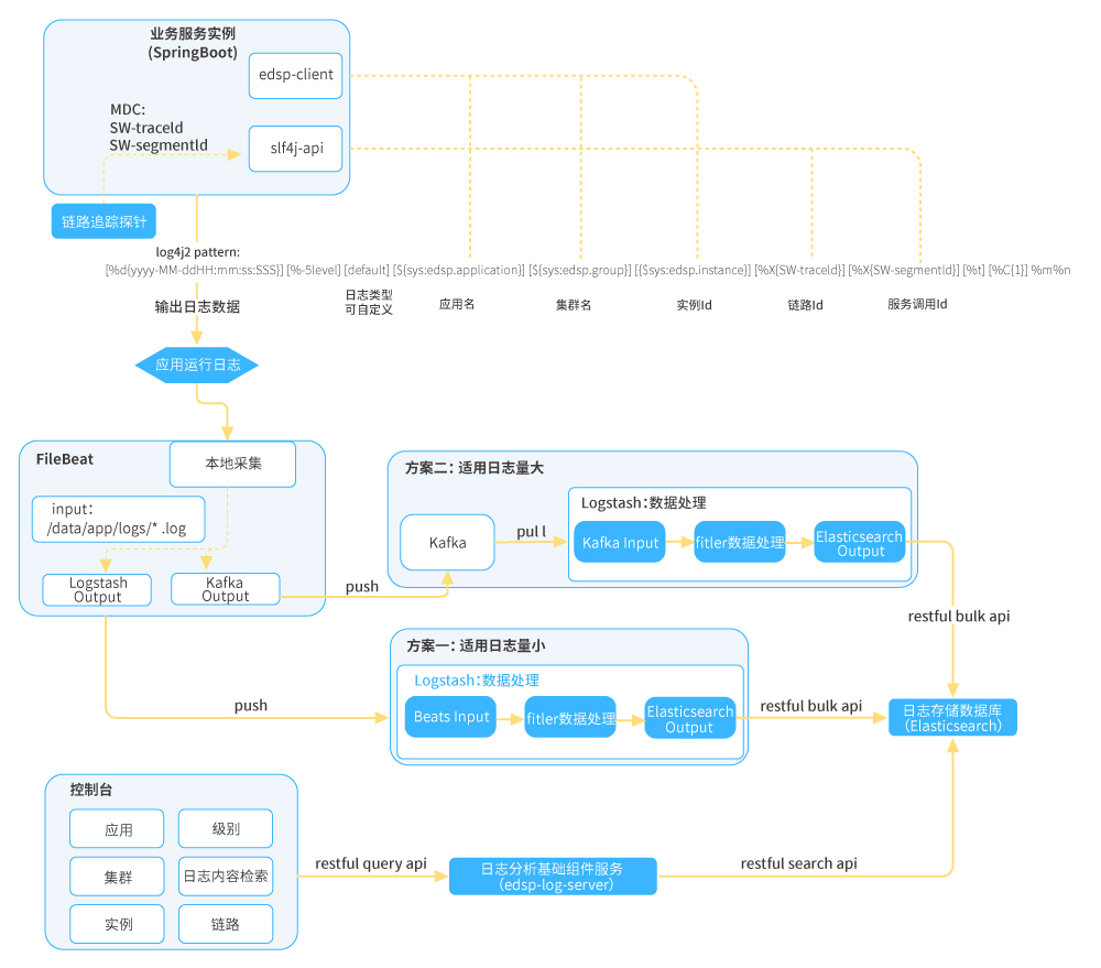 ● 應(yīng)用日志分析:在日志收集和分析領(lǐng)域EFK是普遍采用的技術(shù)方案,但在應(yīng)用日志分析的落地使用上,應(yīng)用日志規(guī)范才是其核心的價(jià)值體系,對于企業(yè)級微服務(wù)日志觀測方面,日志規(guī)范體系需要在日志組件上落地以此作強(qiáng)規(guī)范約束;將規(guī)范中的某些關(guān)鍵數(shù)據(jù)以MDC方式注入,并按標(biāo)準(zhǔn)輸出到日志文件,日志收集組件到指定路徑收集日志數(shù)據(jù)推送至日志分析組件,日志分析組件按規(guī)范解析日志數(shù)據(jù)并進(jìn)行持久化;平臺通過日志分析服務(wù)獲取日志數(shù)據(jù)。