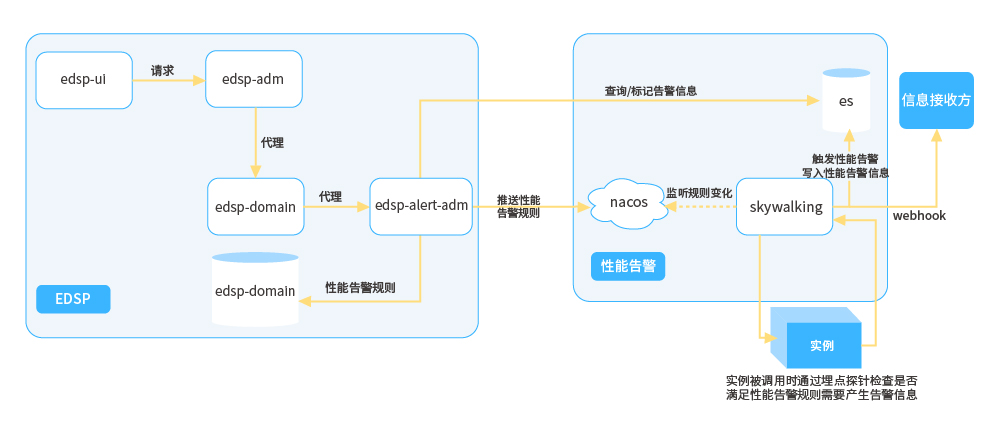 ● 性能告警:通過管控端配置告警規(guī)則提交到告警管理模塊落庫持久化,同時(shí)將告警規(guī)則推送至配置中心,性能告警組件依賴配置中心可以動(dòng)態(tài)感知告警規(guī)則的變化并實(shí)時(shí)生效,然后在APM預(yù)處理接收的性能指標(biāo)數(shù)據(jù)時(shí)立刻計(jì)算告警規(guī)則,對于滿足告警規(guī)則的指標(biāo)數(shù)據(jù)立刻生成相應(yīng)的告警事件,并持久化,隨后產(chǎn)生相關(guān)告警數(shù)據(jù),并將告警數(shù)據(jù)持久化,同時(shí)推送至告警推送系統(tǒng)進(jìn)行下一步推送操作。