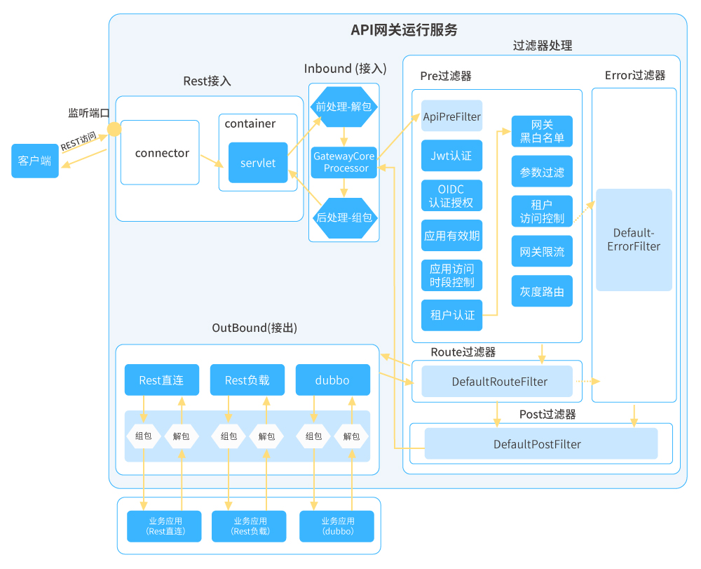 平臺服務(wù)網(wǎng)關(guān)接收到客戶端接入請求,首先會(huì)對報(bào)文進(jìn)行解包成網(wǎng)關(guān)內(nèi)部請求對象,之后走核心過濾器鏈: