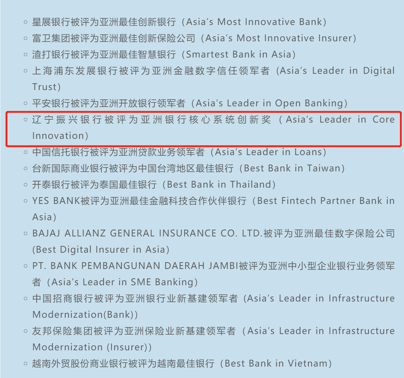 3月26日,IDC于新加坡公布了15家榮膺2021年亞太區(qū)金融行業(yè)創(chuàng)新大獎(jiǎng)的金融機(jī)構(gòu),由長(zhǎng)亮科技中標(biāo)承建的遼寧振興銀行新核心項(xiàng)目憑借著在“微服務(wù)+單元化”創(chuàng)新技術(shù)應(yīng)用方面的突出成績(jī),榮獲“亞洲銀行核心系統(tǒng)創(chuàng)新獎(jiǎng)”。